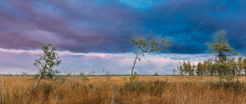 Miory District, Vitebsk Region, Belarus. Yelnya Nature Reserve. Yelnya Reserve (or Elnya) Is Biggest Swamp Complex In Belarus. Bright Colored Dramatic Sky Above Wetland. Yelnya Swamp.