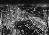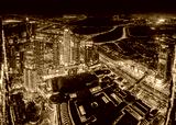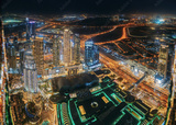 Aerial view of evening night illuminations scenic view of skyscraper in Dubai. Street night traffic in Dudai skyline. Urban background of Dubai, UAE, United Arab Emirates. night illuminations toned