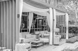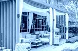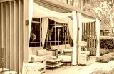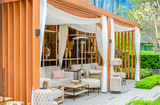 The veranda of the summer cafe in the park.Tables and sofas for outdoor recreation.