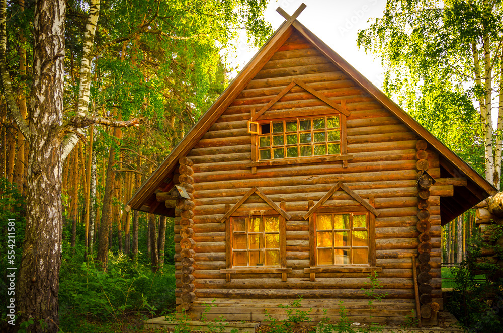 An old village house made of logs in the forest in the early morning.