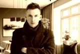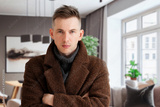 Man in a warm coat trying to warm himself at home. Home heating shutdown concept. Gas shutdown.