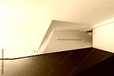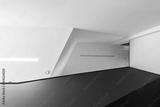 Minimalistyczne schody. Czarno białe wykończenie. Abstrakcyjna kompozycja. jasna i duża klatka schodowa z wyjściem na zewnątrz.