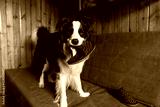 Naughty playful puppy dog border collie after mischief biting slipper lying on couch at home. Guilty dog and destroyed living room. Damage messy home and puppy with funny guilty look