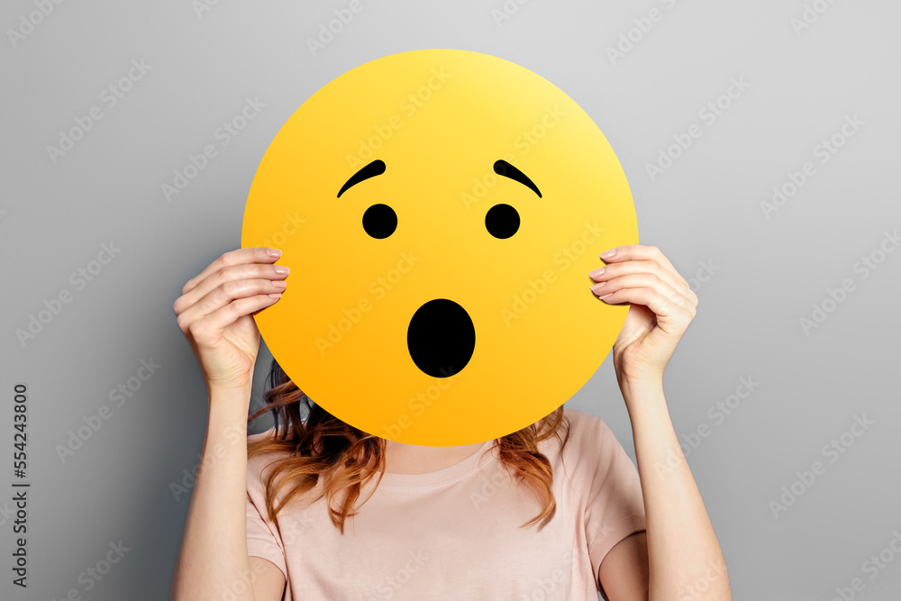 wow shocked emoji. Girl holds a yellow smiley with surprised face emoticon isolated on a grey background. Cartoon face.
