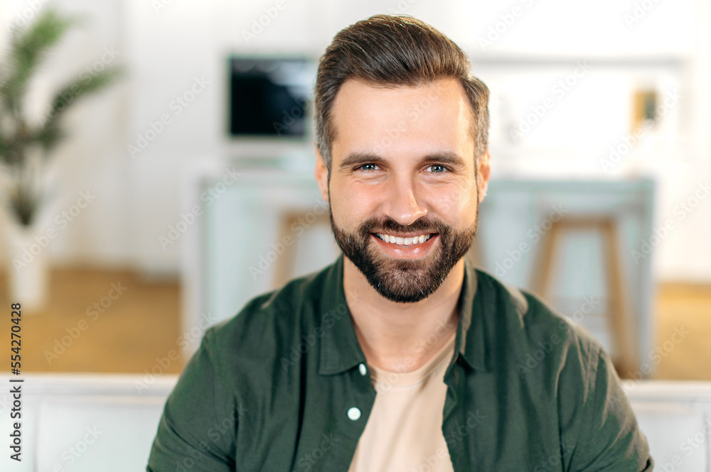 Photo of a handsome charismatic attractive caucasian bearded man, wearing a stylish casual shirt, sitting at home, looking at the camera, smiling friendly and happily
