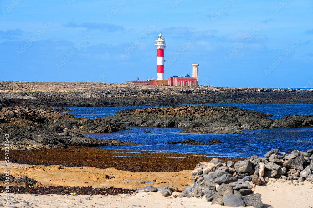 Beach along the Atlantic coast with a view over the lighthouse of El Toston on the north coast of Fuerteventura in the Canary Islands, Spain