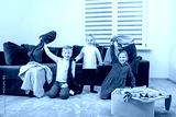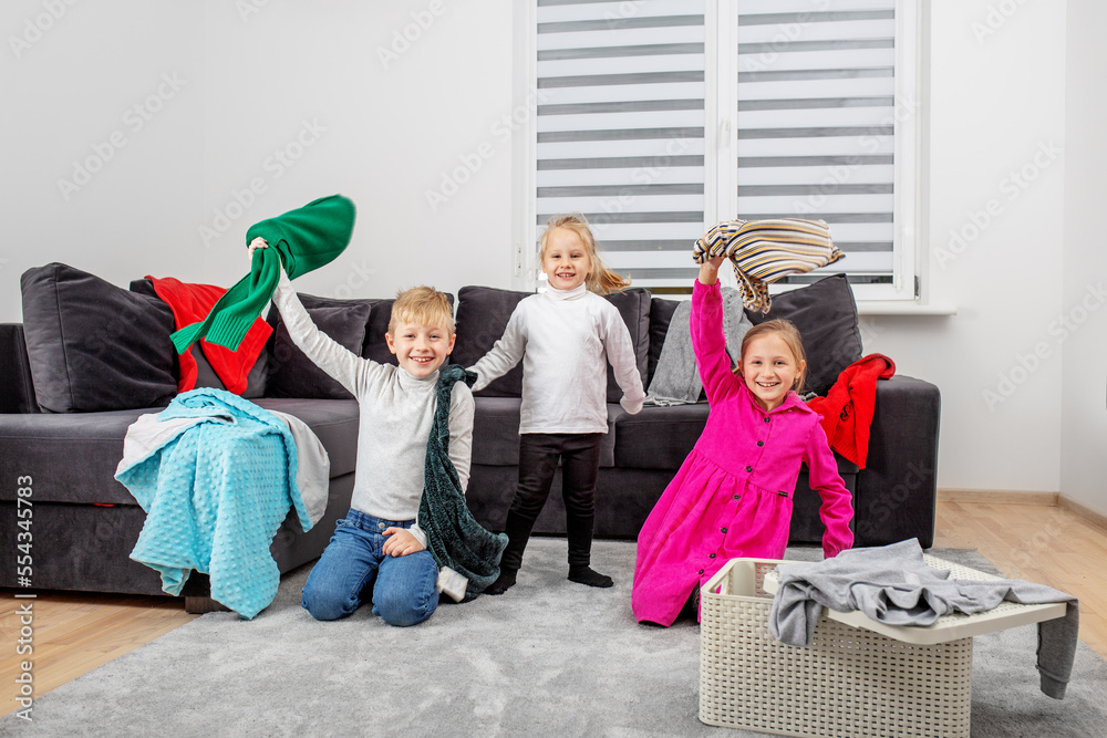 Three children are having fun in room and making mess. Happy childhood. Family concept.