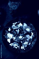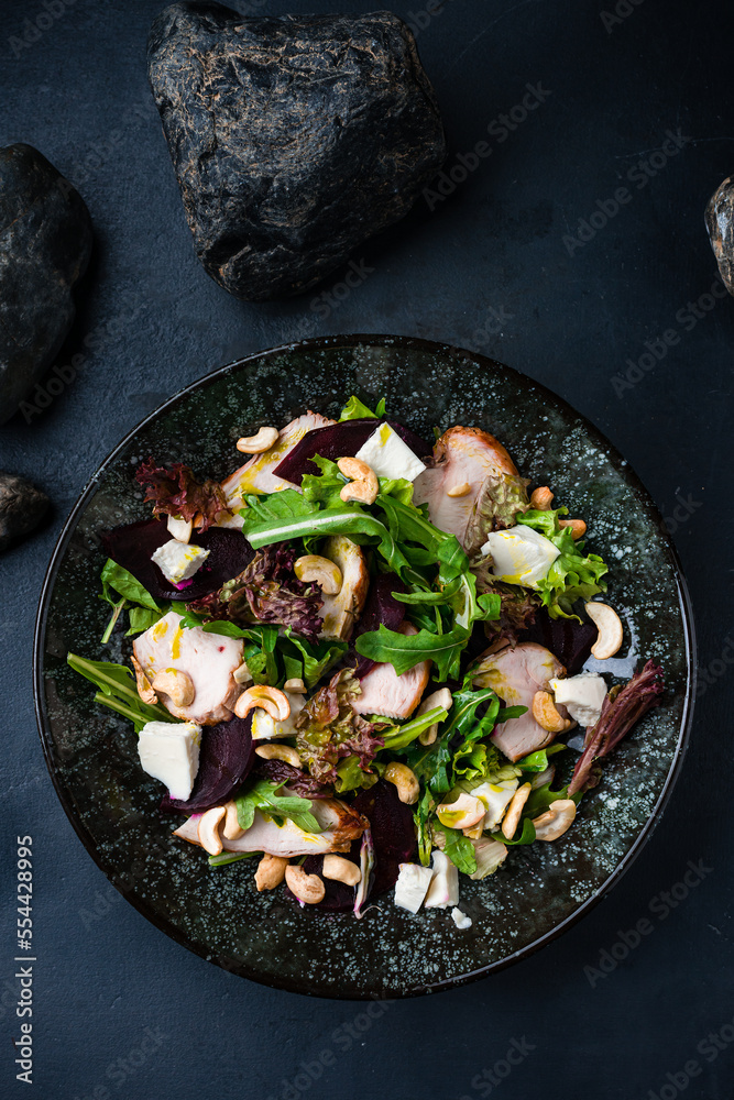 Fresh salad of chicken breast, feta cheese, arugula, lettuce, cashew nuts with olive oil.