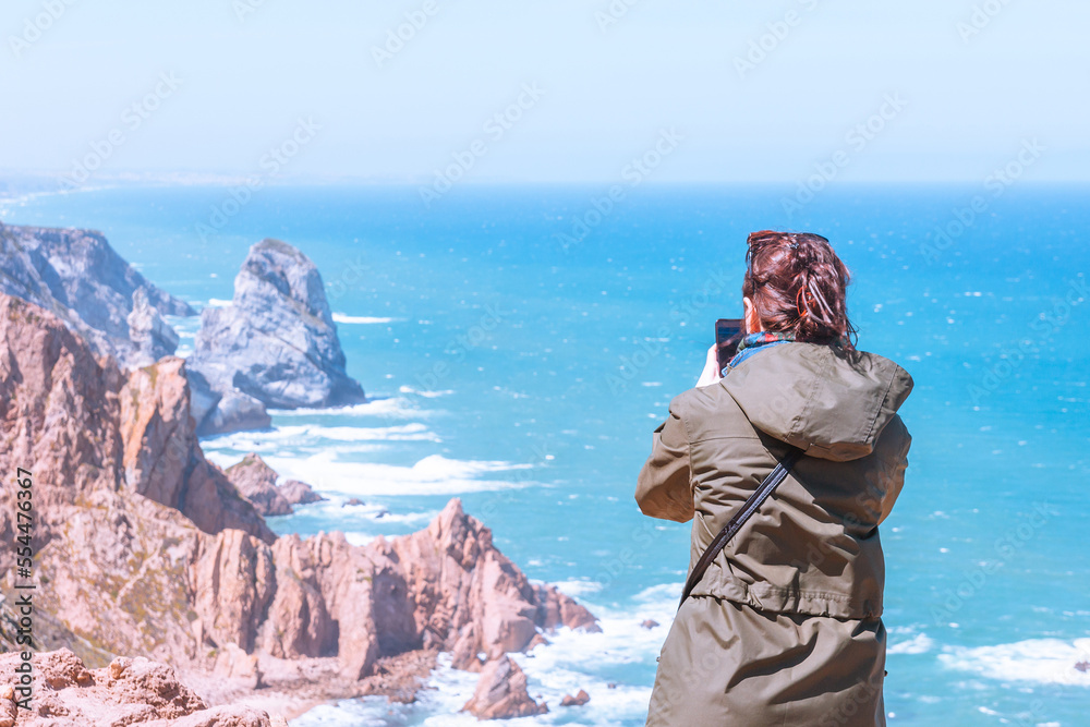 A young girl takes pictures on smartphone stunning view of the ocean and rocks.