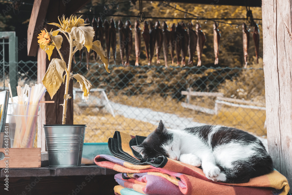 Black and white cat sleeping outdoors on colorful blankets, autumn mood concept