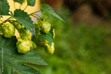 Farming and agriculture concept. Green fresh ripe organic hop cones for making beer and bread, close up. Fresh hops for brewing production. Hop plant growing in garden or farm