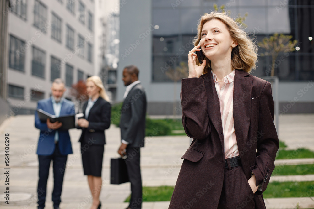 Blonde businesswoman standing and talking on the phone in front of modern office