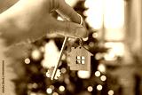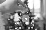 Key to the house in hand on background of Christmas tree. Gift for New Year, Christmas. Building, design, project, moving to new house, mortgage, rent and purchase real estate. Copy space