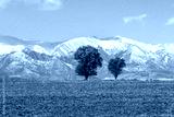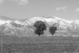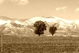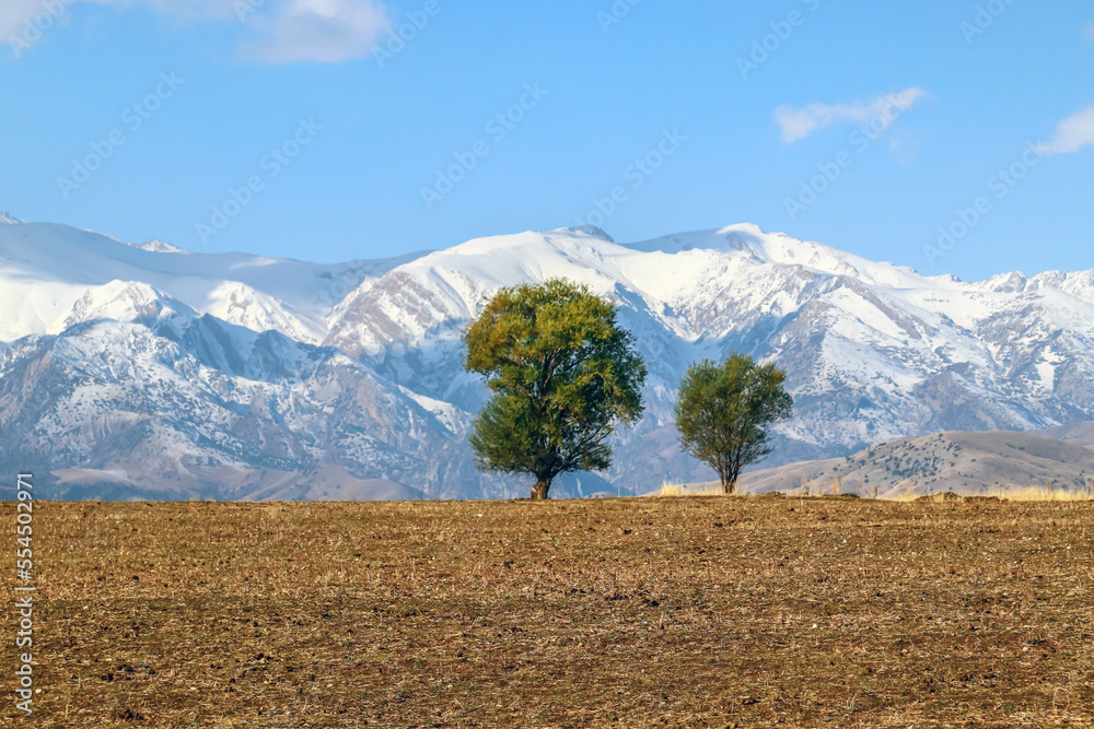 Lonely tree in a field against the backdrop of snow-capped mountains in autumn.Beautiful picturesque landscape