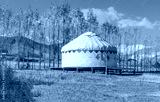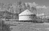 A white yurt against the background of young poplar trees in the mountains. The dwelling of nomad breeders.