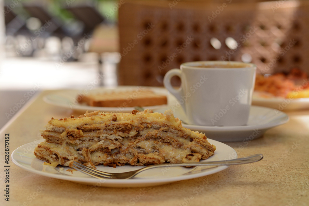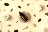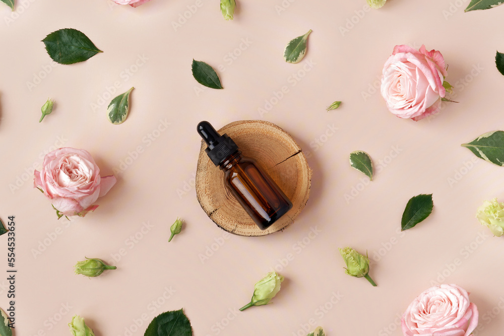 Wooden podium with amber glass dropper bottle on trendy pastel beige background with flower buds, leaves, petals. Abstract cosmetics composition with roses. Beauty layout. Summer, aroma water concept
