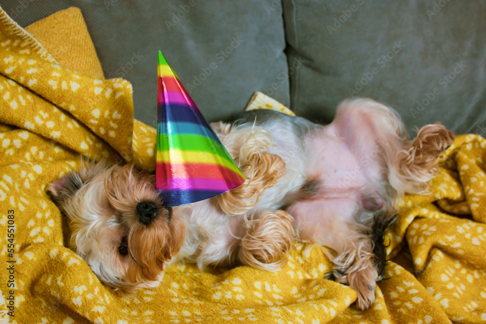 Cheerful playful little Yorkshire Terrier dog playing frolicking at home. A cute puppy doggy lies on back on a yellow plaid on a couch and chewing on a party cap. Pet's birthday party. Lapdog has fun.