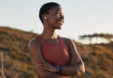 Black woman runner, smile and music with earphones, nature and hill for fitness, happiness and peace. Outdoor exercise, streaming and smartwatch for girl on training, running or wellness adventure