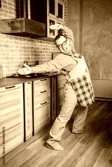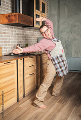 Funny happy smiling man wearing pinafore dancing on the kitchen