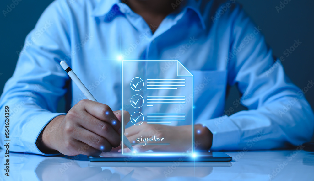 Electronic signature business concept. Manager is electronic signing investment approval, business approved, executing plan, project approved. digital signature. electronic documents, digital business