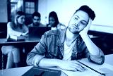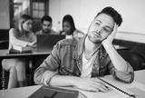 Education, university and bored student in classroom thinking studying for exam. Sad young man at college, boredom and stress, depression or anxiety with book and academic students at desk on campus.