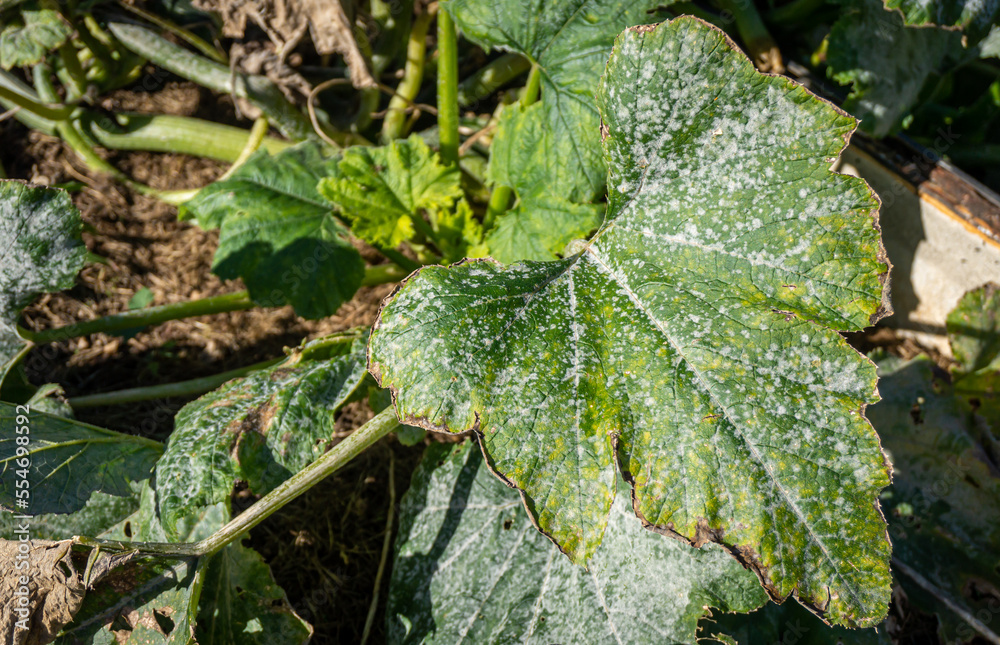 Marrow squash leaf strongly affected by a powdery mildew fungal disease close-up.