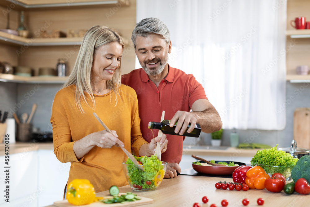 Good-looking spouses preparing healthy vegetable salad at home, copy space