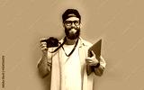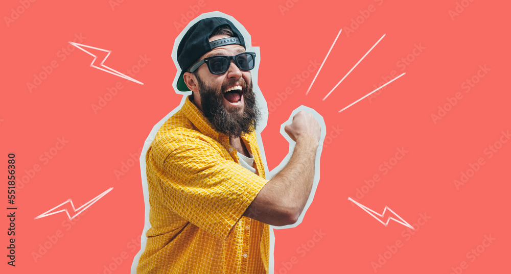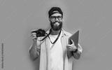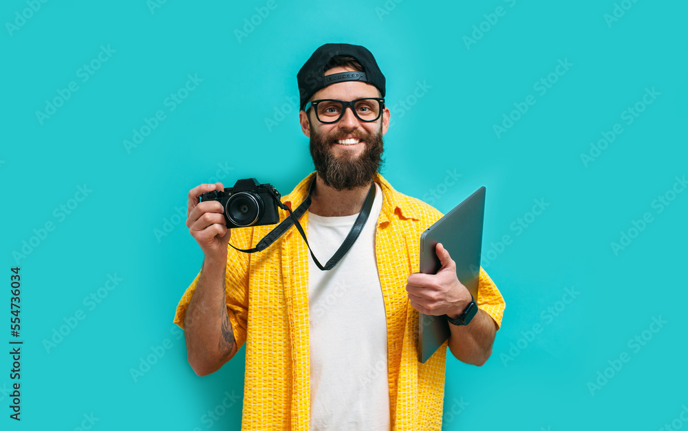 Young funny hipster photographer isolated on blue background with laptop in hand. Lifestyle work as a freelancer