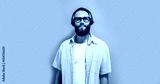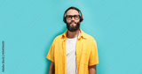Call center operator, online store service manager wears headphones speaks into microphone answers call, leads negotiations advises online sales. Isolated on blue background