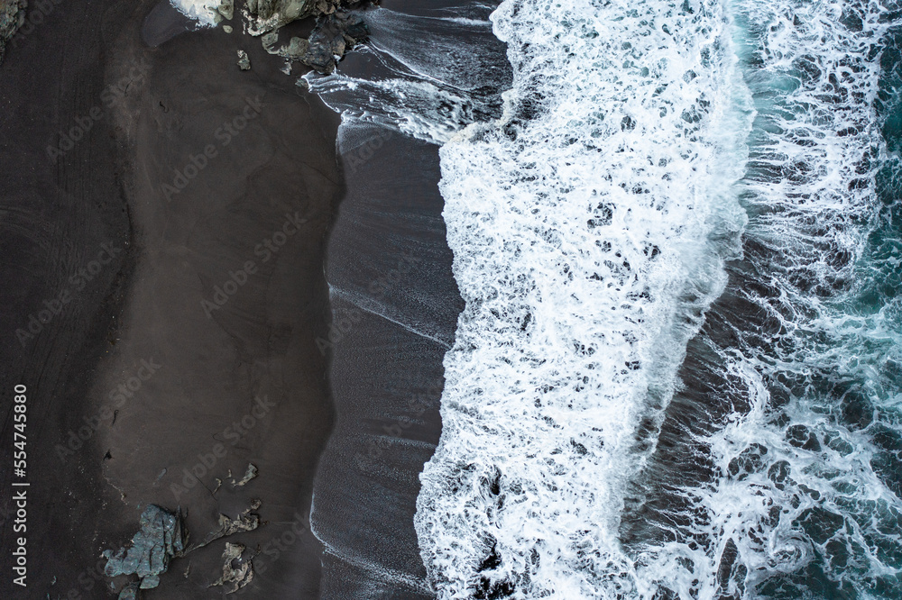 Aerial view of chilean ocean with black snd beach. Top view from drone