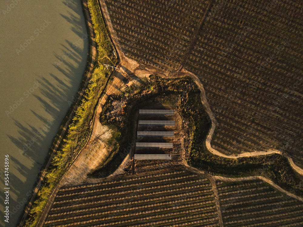 Aerial view of solar power plant solar panels on vineyard. Electric panels for producing clean ecologic energy.
