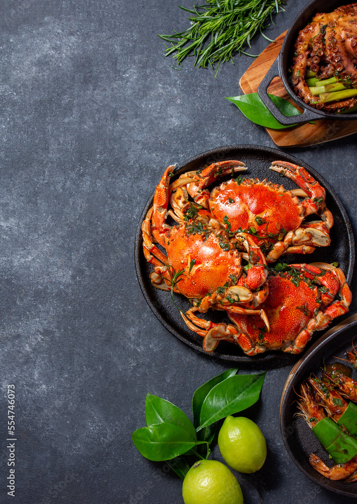 Set of Seafood Dishes. Crabs, octopus, squids and tiger shrimps on cast iron pans and plates on a black background. Top view. Copy space for text.