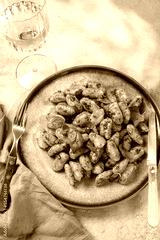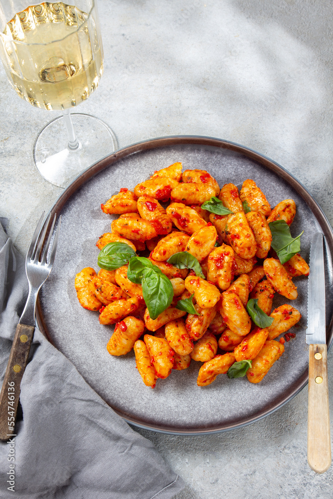 Traditional Italian potato Gnocchi with tomato sauce and fresh basil on gray plate, marbled backround.