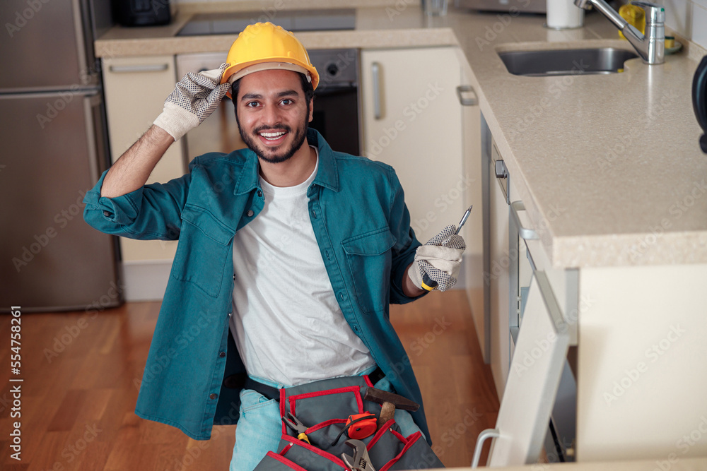Male worker in uniform is assembling furniture on kitchen. Repair concept. High quality photo