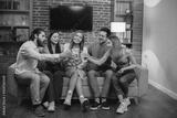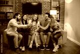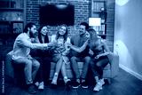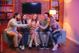 Five friends sitting on a sofa in a cozy room and clink paper cups with beverages
