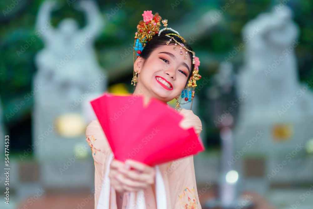 Asian Happy little girl wearing Chinese costumes holding red envelopes decoration for Chinese new year festival celebrate culture of china at Chinese shrine Public places in Thailand