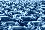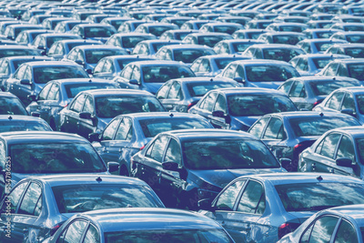 Rows of a new cars parked in a distribution center on a car factory on a sunny day. Top view to the parking in the open air.