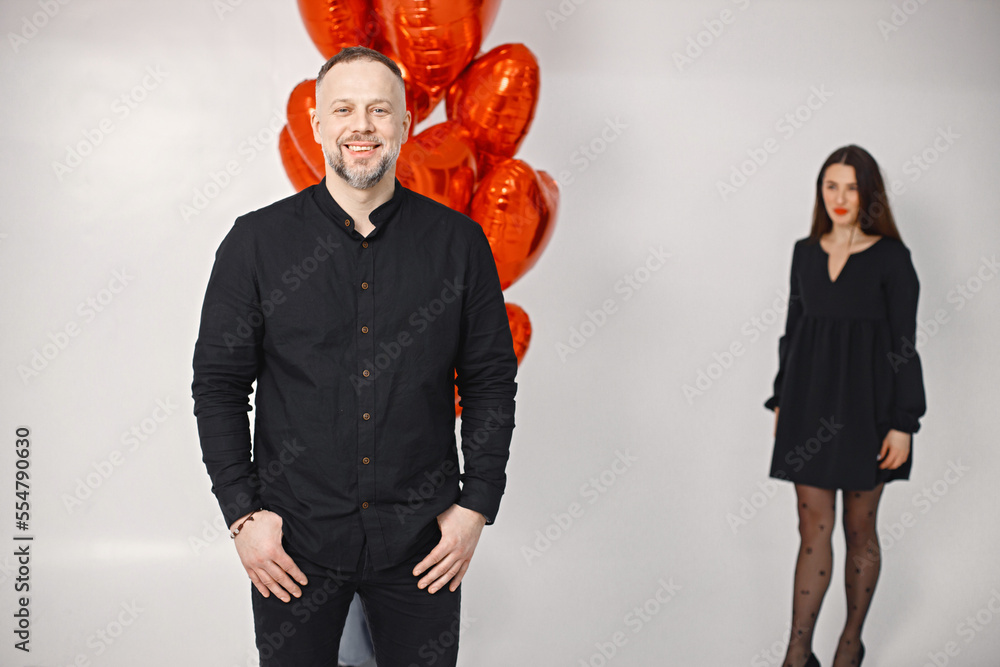 Man standing in front of bunch of heart-shaped red ballons posing in studio