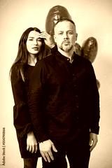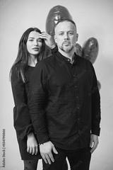 Man and woman posing in studio near bunch of heart-shaped red ballons