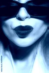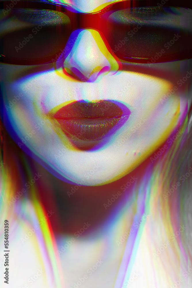 Fashion, make-up and lifestyle concept. Beautiful woman close-up studio portrait with sunglasses and lipstick making kiss facial expression in RGB color split effect. Futuristic looking style