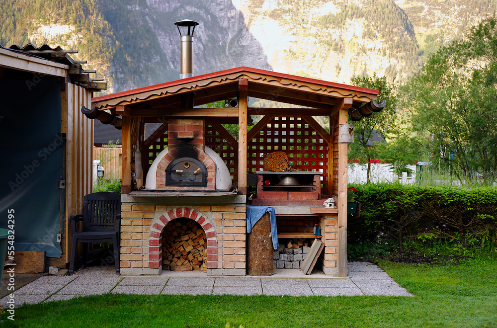 A shed with a small oven and a firewood storage outside the house in the courtyard.