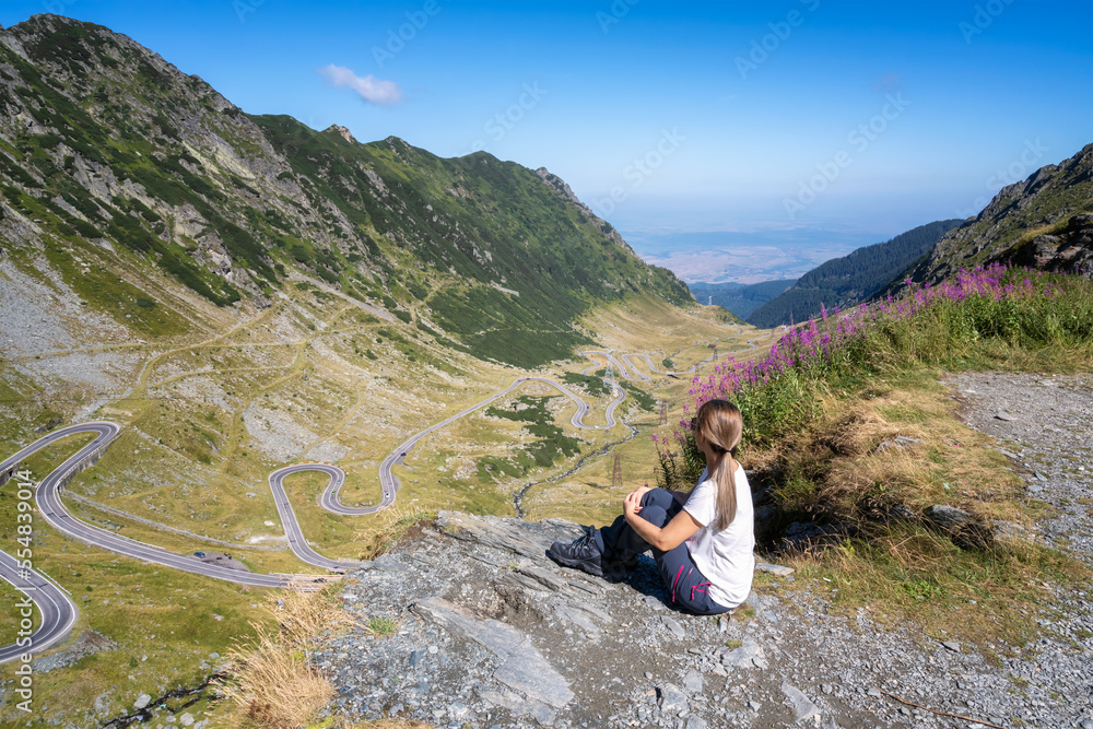 Rear view of a young woman standing at a cliff edge looking from the top at famous Transfagarasan mountain road in Romania..Beautiful girl enjoying the nature beauty.