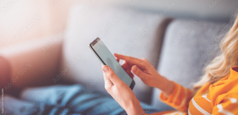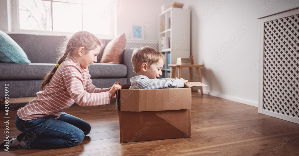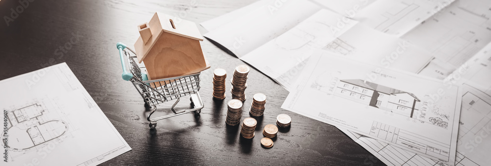 Panoramic view of the shopping cart with model of the house in it on the black desktop.