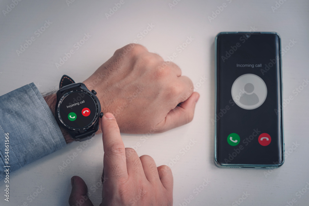 Wireless connection of a modern watch with a smartphone. incoming call on a modern smart watch. black smart watch and a smartphone on a white background.
