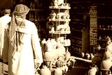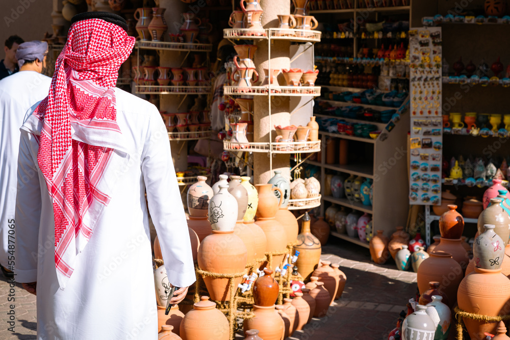 Omani Souvenirs. Hand Made Pottery in Nizwa Market. Clay Jars at the Rural Traditional Arabic Bazaar, Oman. Arabian Peninsula.