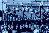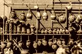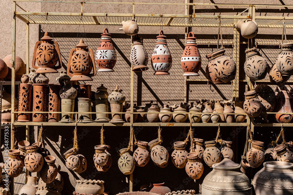 Omani Souvenirs. Hand Made Pottery in Nizwa Market. Clay Jars at the Rural Traditional Arabic Bazaar, Oman. Arabian Peninsula.
