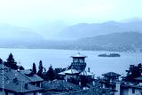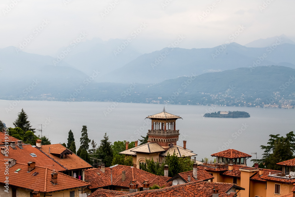 Mountain lake and city on green hills in Italy