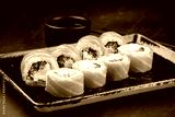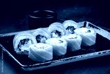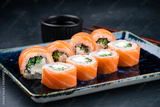 Set of sushi rolls Philadelphia with salmon, cream cheese, cucumber, rice and nori.
