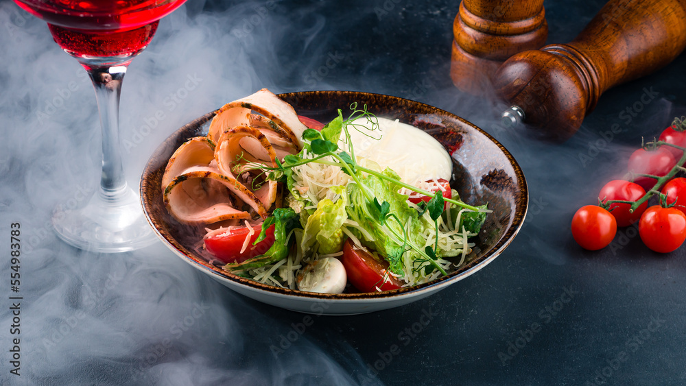 Italian food Caesar salad with chicken, parmesan cheese, lettuce, tomatoes and eggs in smoke.