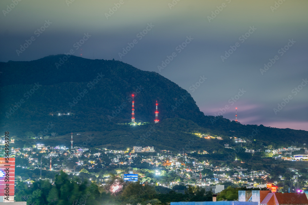 Large communication towers high in the mountains at night. The beautiful city Tuxtla Gutiérrez in Mexico.